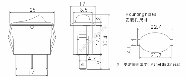 工作参数 Contact Rating: 250VAC,6A 接触电阻 Contact Resistance: 35mΩ MAX 绝缘电阻 Insulation Resistance: 500VDC,50MΩ 耐压强度 Dielectric Strength: 1250VAC,1MIN 工作温度 Operating Temperature: T100 电器寿命 Electrical Life: 10000 Cycles |