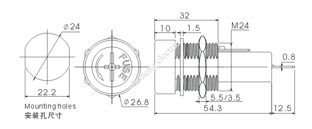 • 电气特性 保险丝规格 额定电流 额定电压 额定功率 接触电阻 绝缘电阻 耐压 10 x 38 30A AC600V 6W 5m 100 M 3000Vac/60 冒盖型式: 螺纹手拧式 材料:绝缘体 PR UL 94 V0 接触件:CuZn 37 + Ni + Sn 用于装
