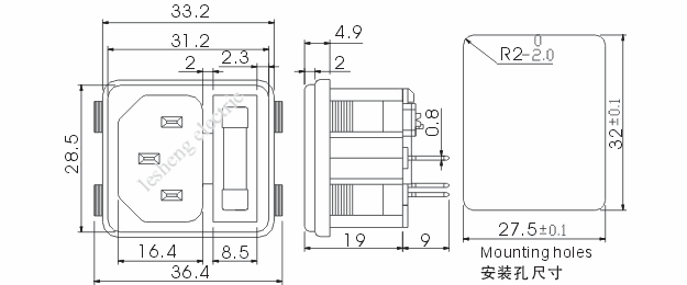 6. 装配方式:插卡式,装配板厚度1.0、1.5或2.0mm