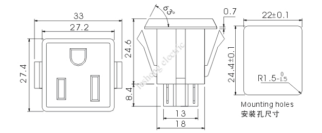 装配方式:插卡式,装配板厚度0.8,1.0,1.2,2.0或2.5mm